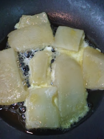 Mula-mula aku goreng tanpa telur. Untuk melembutkan dia. Memang lembik habis cake ni bila kena heat. Dah macam dodol pulak gayanya. Tapi putih melepak.
